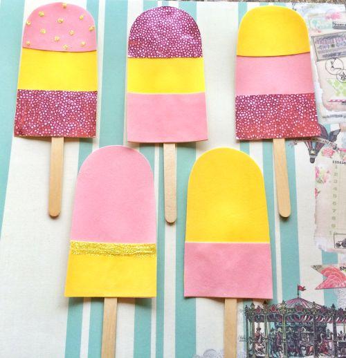 Draw a popsicle shape or download a popsicle pattern and cut out. Trace onto various sheets of metallic and velour paper, cut out. Glue to white art boardΒ using craft glue, let dry and re-cut. For adults zip dry works well, for kids use craft glue sticks.
