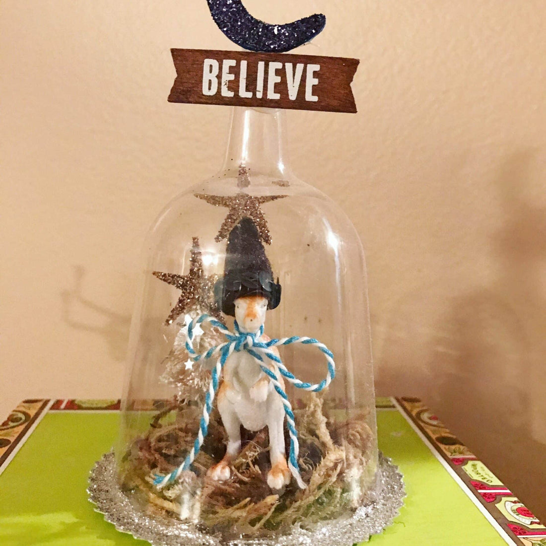 Begin building your time capsule scene onto the cut paper circle. Glue everything onto the circle shape, leaving a 1/2 inch border. This is so you can place the wine/drinking glass base over it. We choose to do a travel time capsule from our travel bucket list to Australia. Ours was created with a toy kangaroo, moss, starfish, bakery twine, tiny tree and Hygloss Felt for the hat and Hygloss Silver Foil Star Sticker.