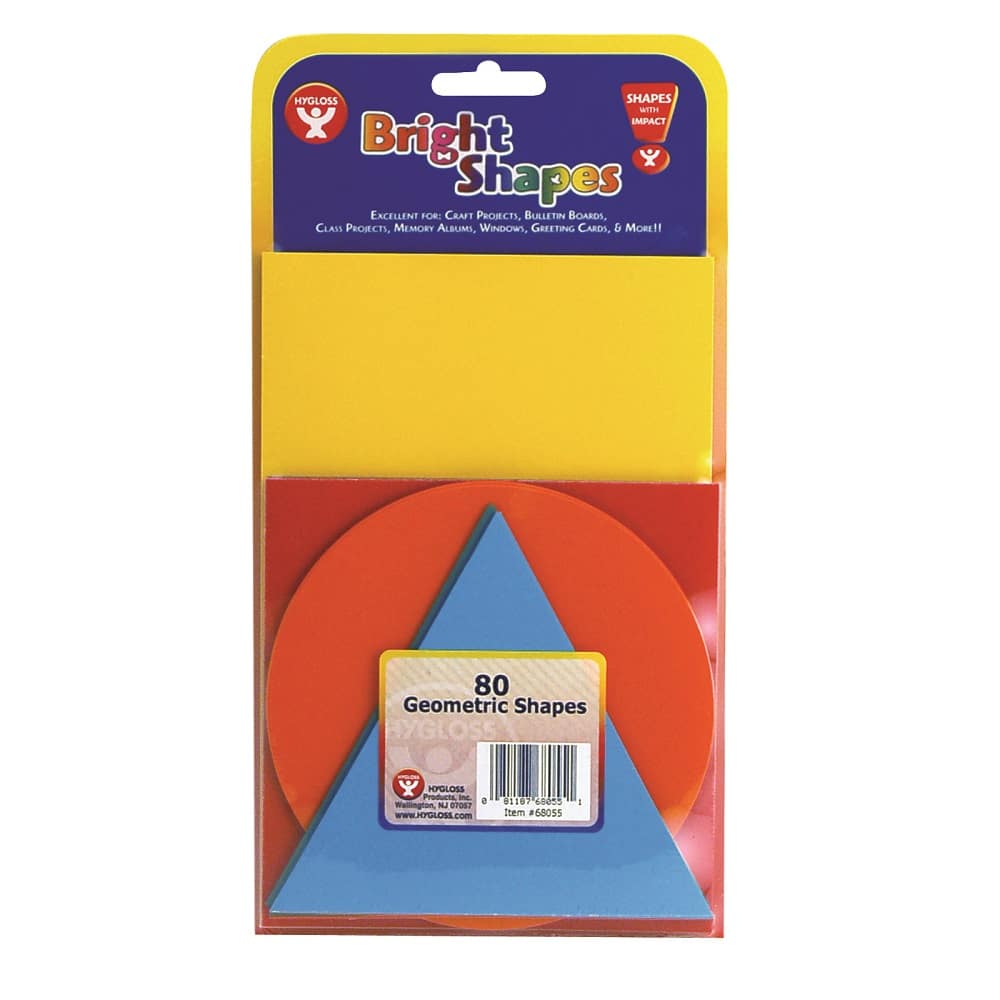 Shapes include: squares; circles; triangles; rectangles Geometric paper shapes are great for teaching colors, numbers, patterns, shapes and math concepts in a hands-on way. Choose from 40 of 9", 80 of 5", or 120 of 3" shapes in text weight paper. All packages include circles, triangles, squares and rectangles. The shapes are pre-cut from high quality 60 lb. paper in assorted vibrant colors.