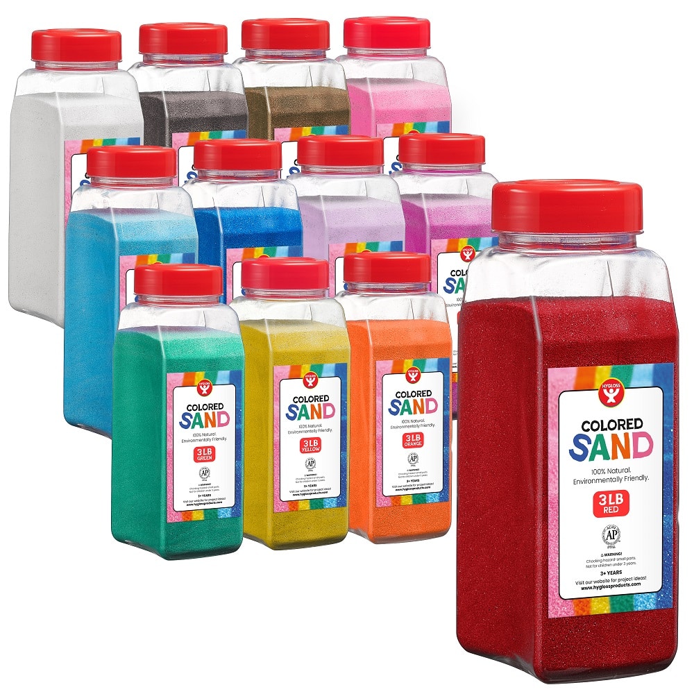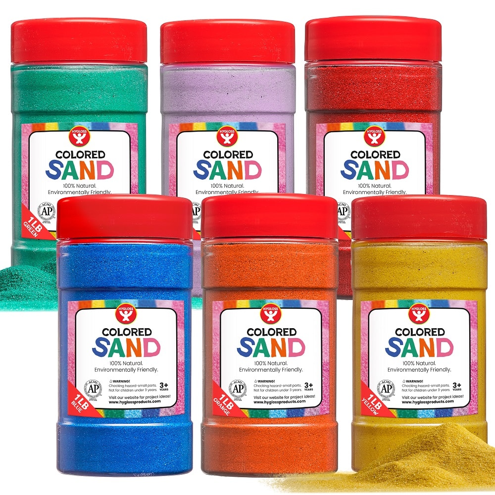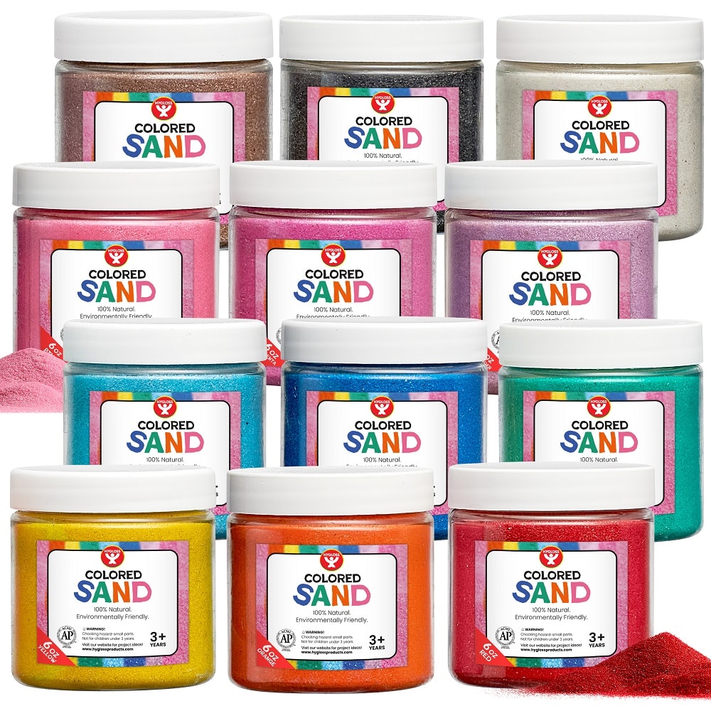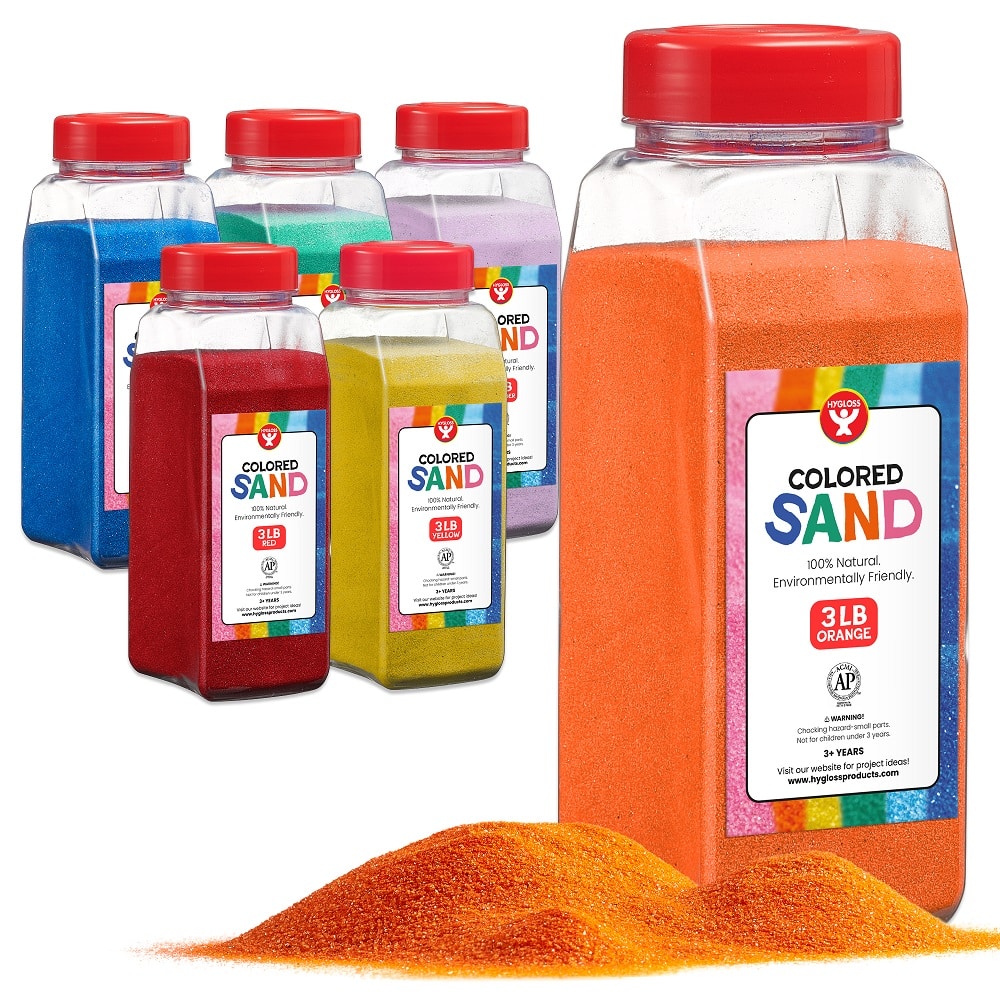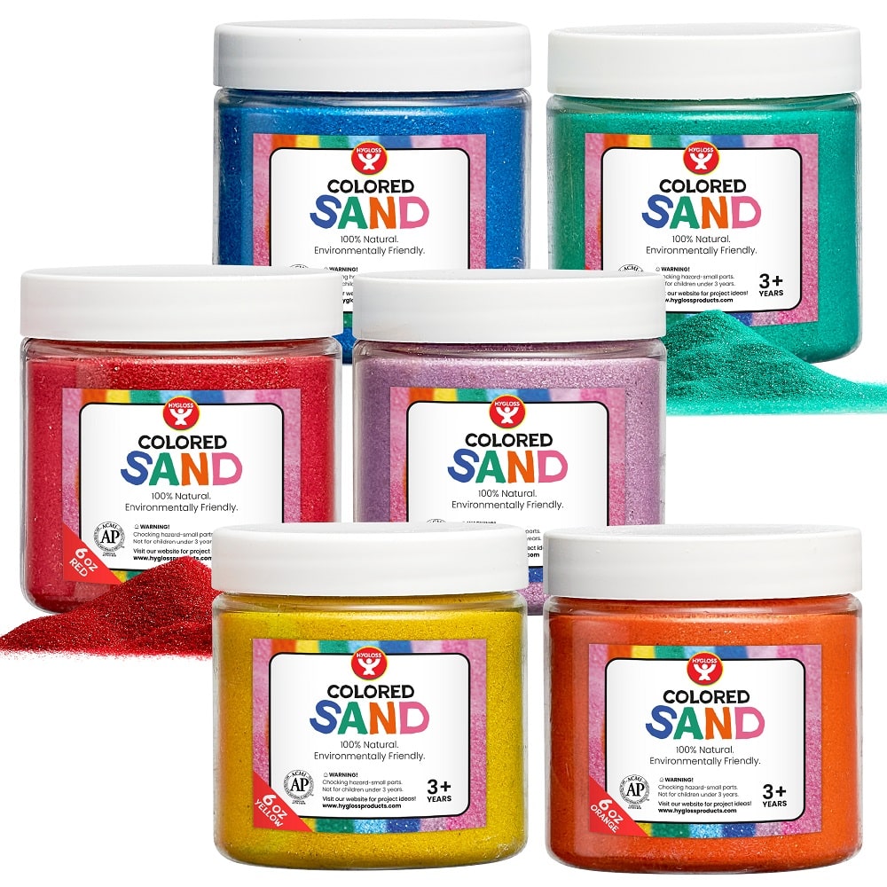 Hygloss Colored Sand the perfect craft sand for all your creative needs. Natural and environmentally friendly, this colored sand is extra fine, easy to clean-up, and safe for kids. The sand comes in 14 different colors as well as assortment packs.Β You'll have a color for every project!Β Each color is packaged in no-mess, easy-to-pour containers. The sand is uniform in size and the colors are vibrant, making it the perfect craft medium for beautiful sand art and layering in a bottle. Brighten your room; fill a glass vase with bright colored sand and add a fake plant. The craft sand is also great for DIY sand candles! Colorful Sand is helpful for teachers who want to incorporate tactile learning into their lessons. Pour sand onto a flat surface or plate, and let children use their fingers to draw letters, numbers, shapes and more right in the sand!