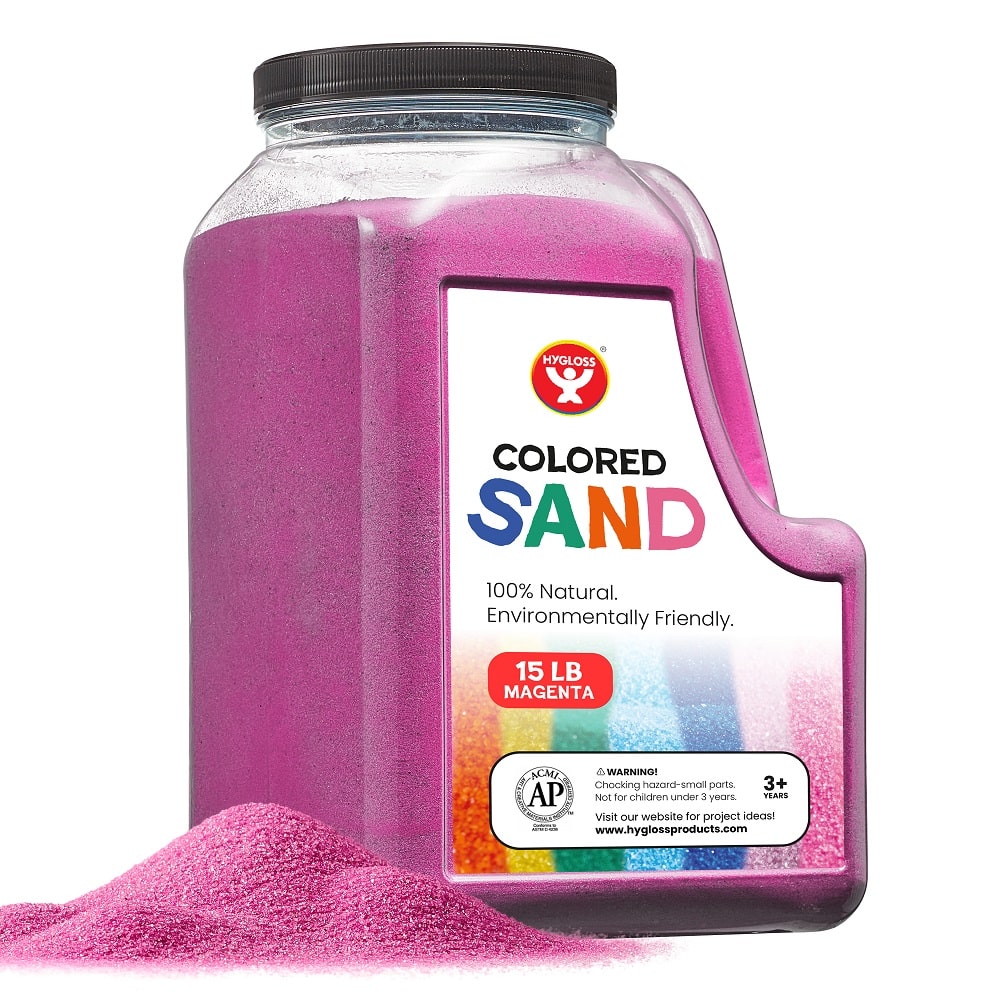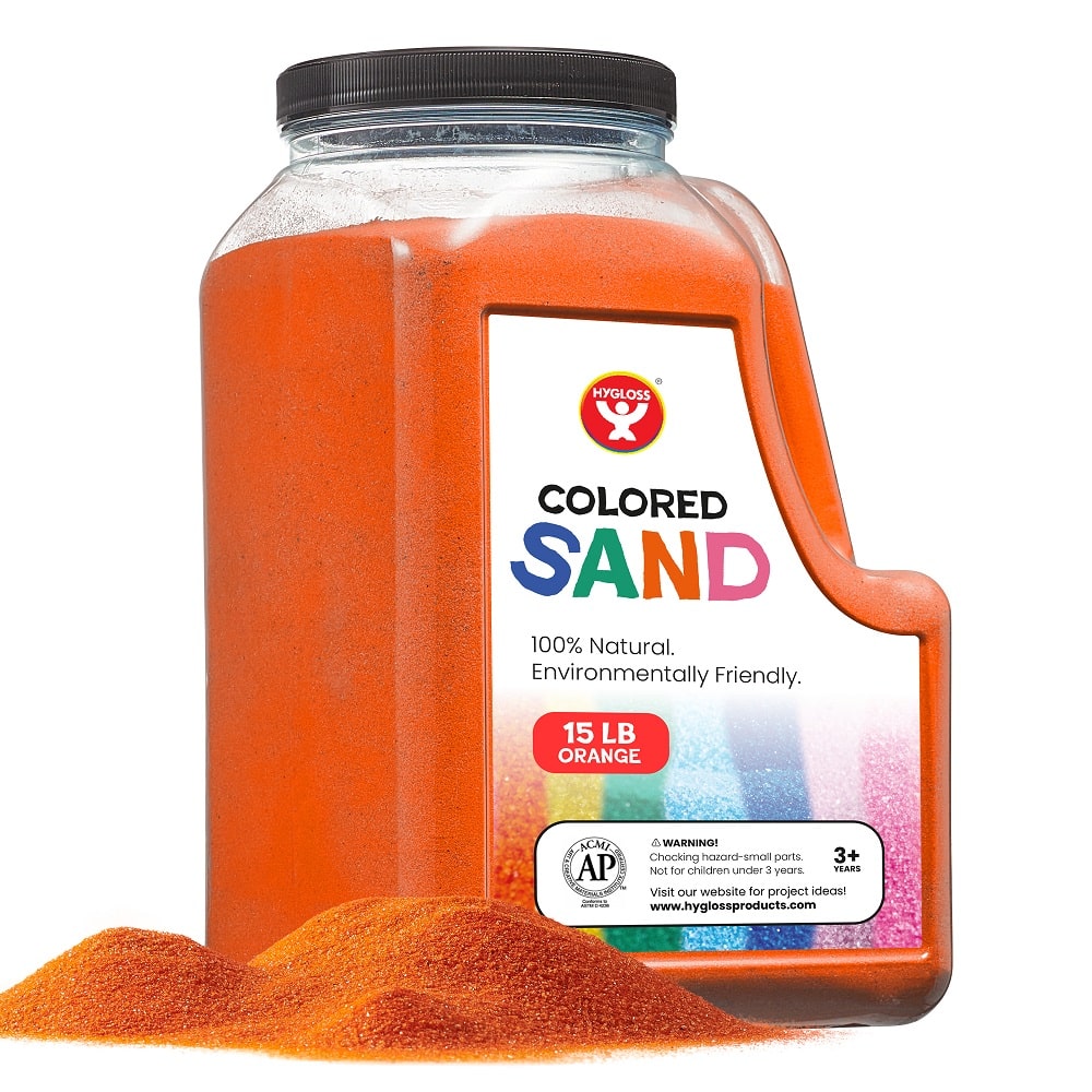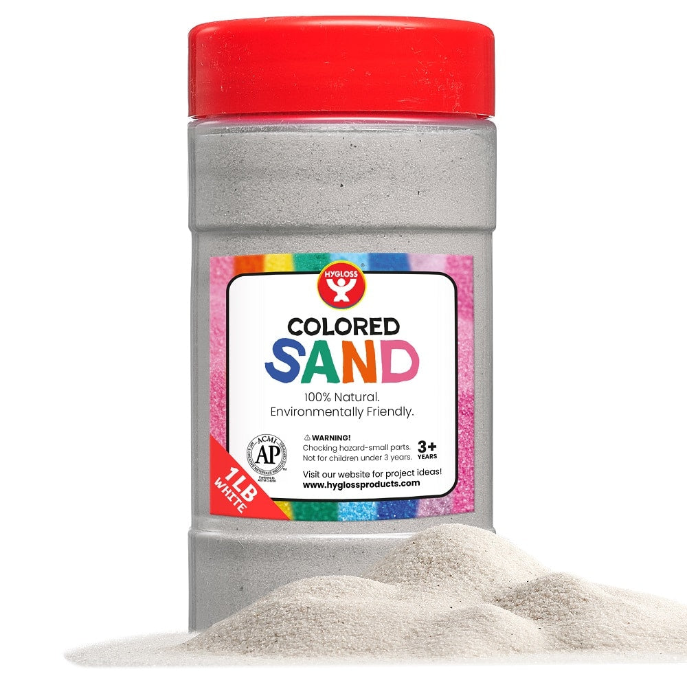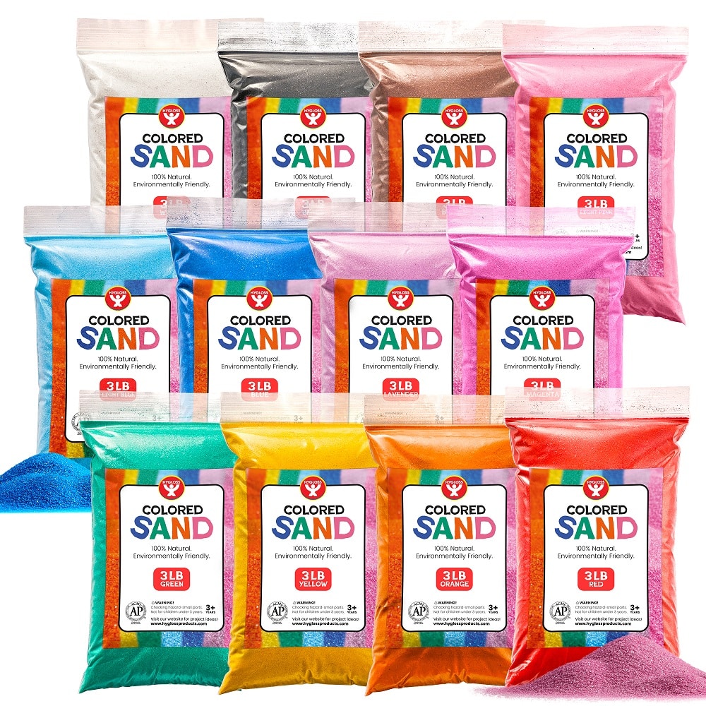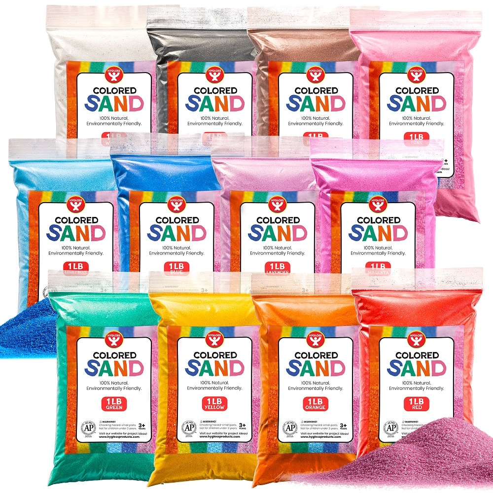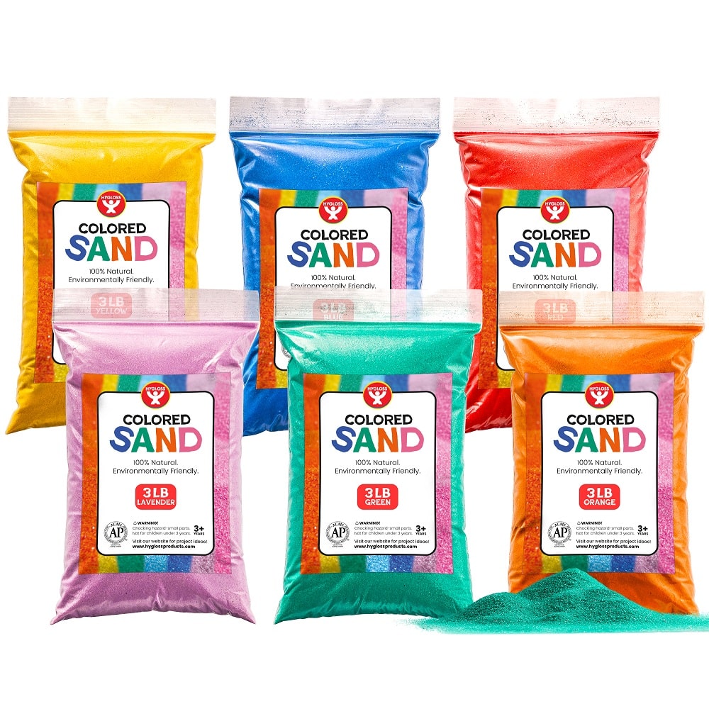Hygloss Colored Sand the perfect craft sand for all your creative needs. Natural and environmentally friendly, this colored sand is extra fine, easy to clean-up, and safe for kids. The sand comes in 14 different colors as well as assortment packs.Β You'll have a color for every project!Β Each color is packaged in no-mess, easy-to-pour containers. The sand is uniform in size and the colors are vibrant, making it the perfect craft medium for beautiful sand art and layering in a bottle. Brighten your room; fill a glass vase with bright colored sand and add a fake plant. The craft sand is also great for DIY sand candles! Colorful Sand is helpful for teachers who want to incorporate tactile learning into their lessons. Pour sand onto a flat surface or plate, and let children use their fingers to draw letters, numbers, shapes and more right in the sand!