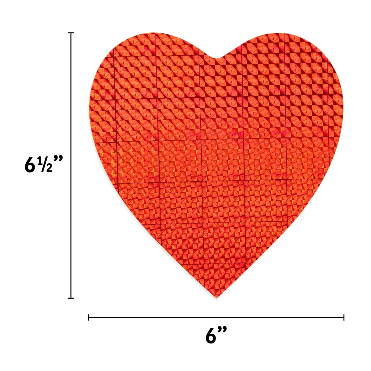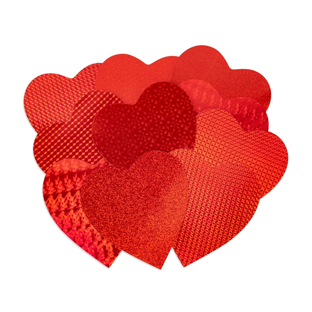 Made from durable holographic card stock. These 6-inch Red Holographic Heart Cut-Outs are a great craft item to have on hand. Spruce up your next Valentines craft, classroom decoration or party decor with reflective, holographic hearts. Show your love to someone special with a homemade holographic card. Package contains 10 red hearts in assorted holographic designs.