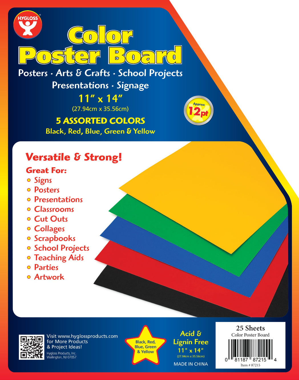 Bold Color Poster Board helps you get your message across. Perfect for crafts that need a sturdier medium, collages & card making. Comes in assorted colors: Red, Yellow, Green, Blue & Black.