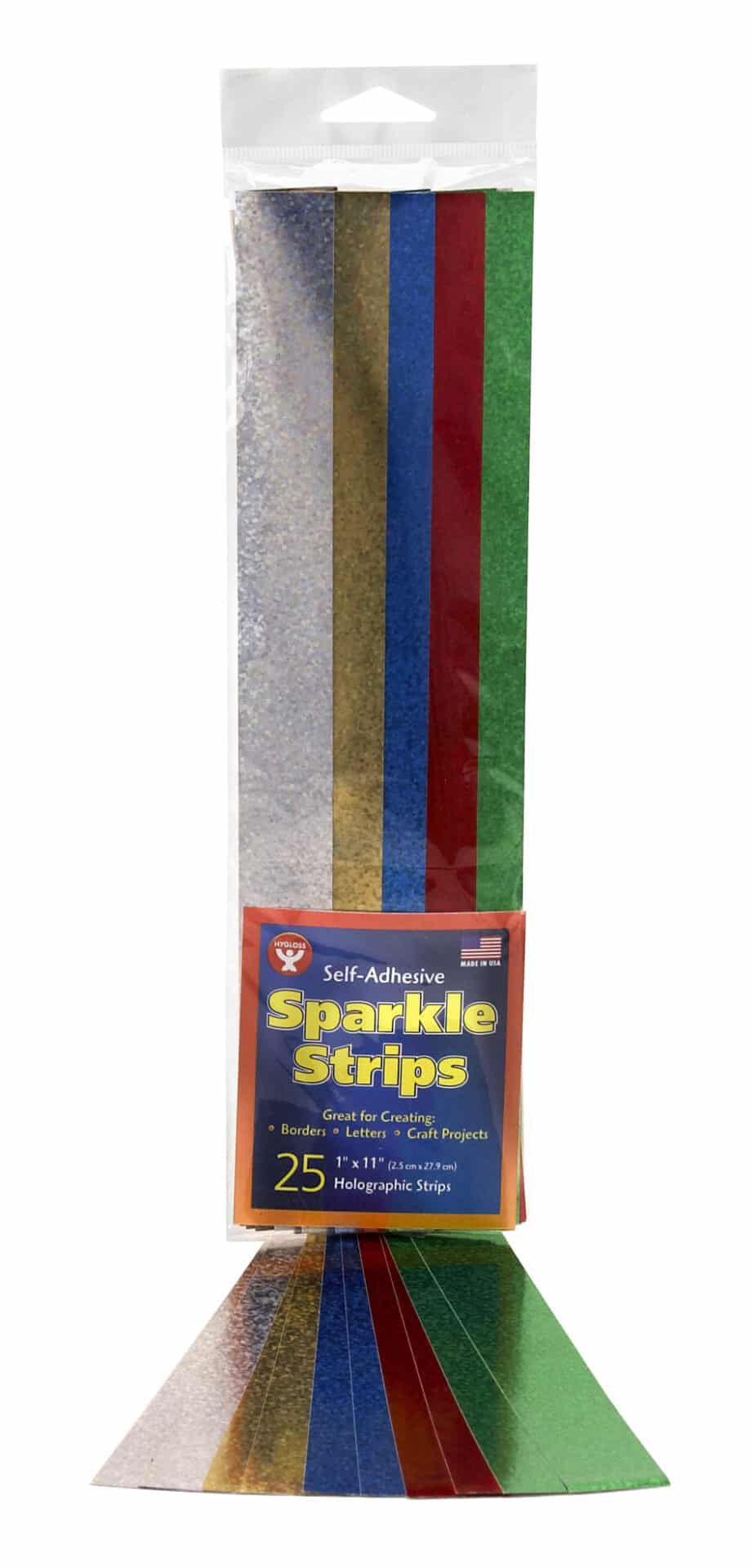 Self-adhesive strips of holographic paper are great for scrap-booking, borders, lettering and much more! These extra large pre-cut strips measure 1" x 11", and come with 25 per pack. OurΒ Self Adhesive Holographic Sparkle Strips are the highest quality, and come in 5 vivid, sparkling colors. Make stunning classroom decorations, bulletin board borders, holiday crafts and centerpieces. These handy pre-cut strips of holographic paper are great for scrapbooking, borders, lettering and much more. The self-adhesive backing means no messy glue required; just peel off the liner and stick!