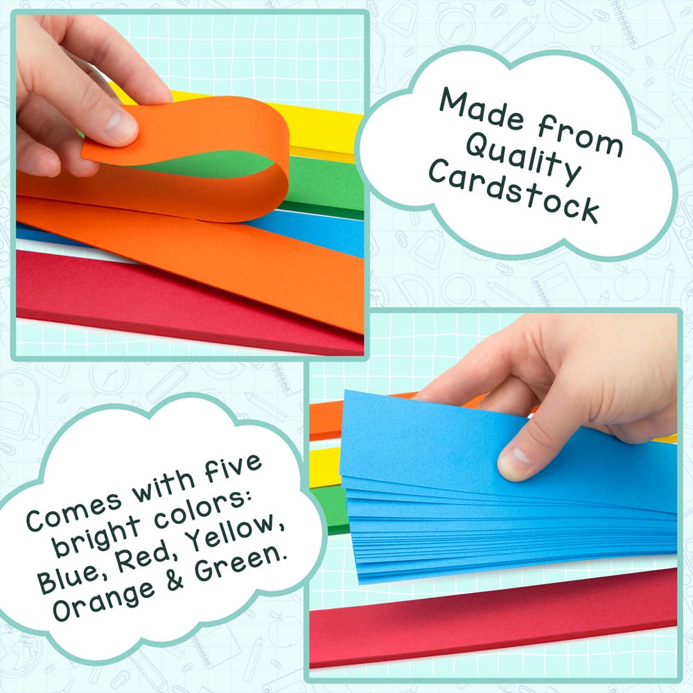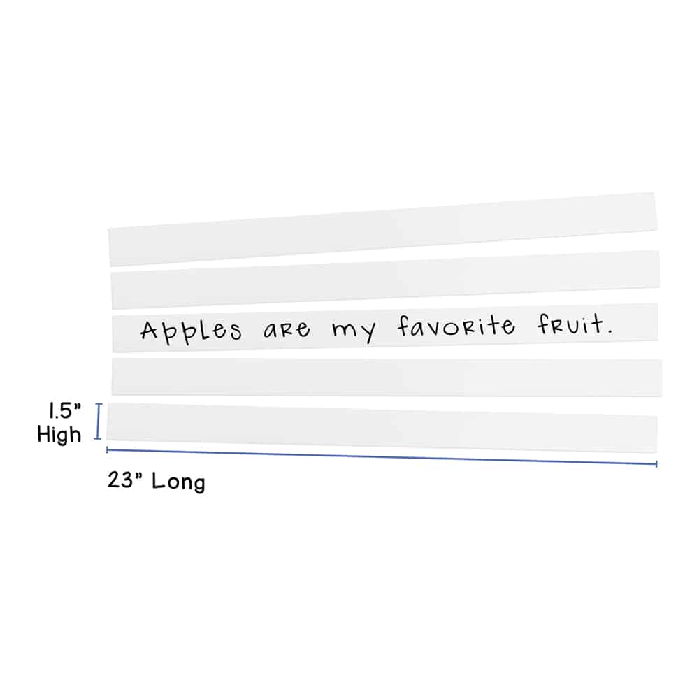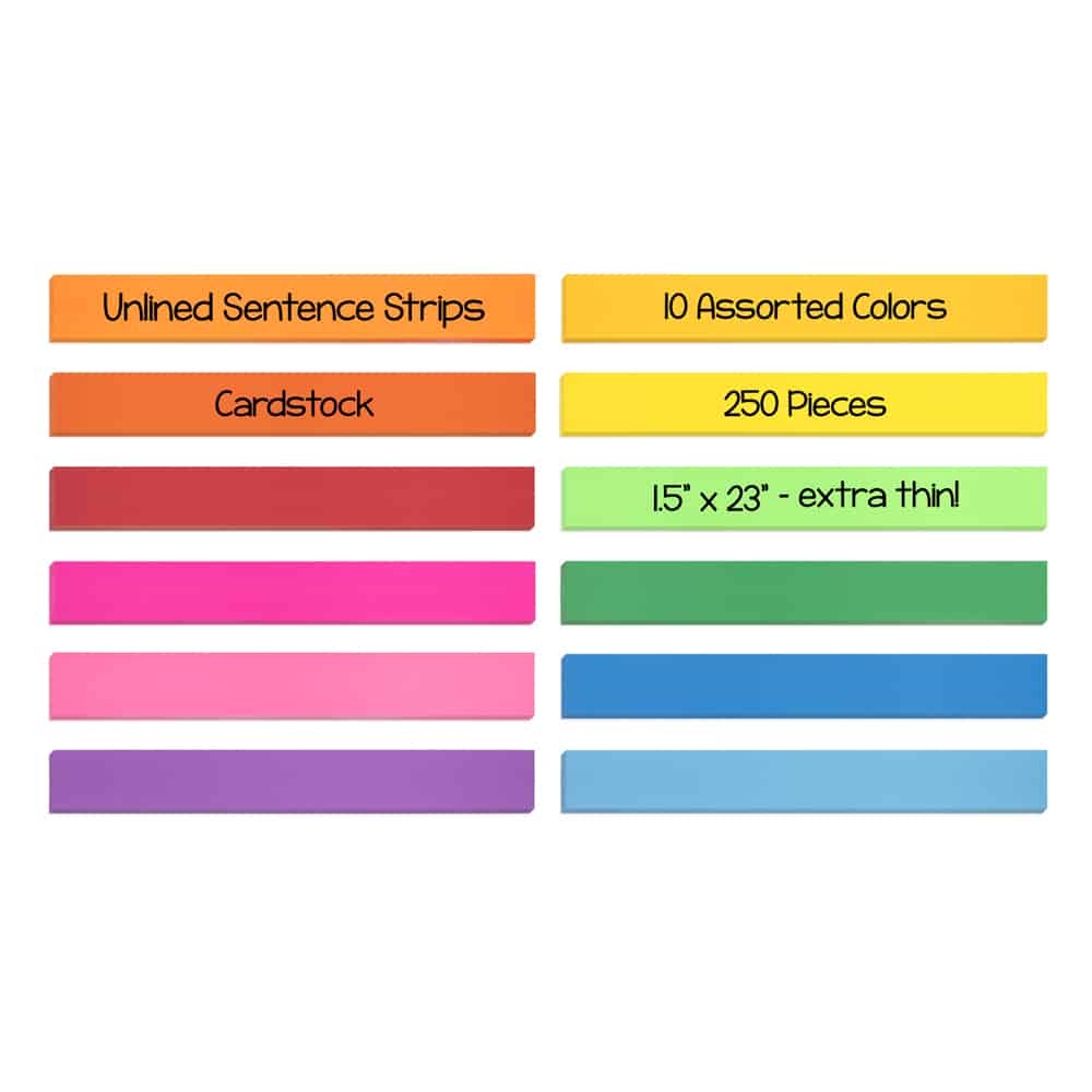Sentence strips are perfect for use as an educational tool for pocket charts, flash cards, desk nameplates and sight-word lists. Our high quality cardstock sentence strips are just 1.5" high, thinner than most, allowing you to fit more strips into your space! Our Thin Sentence Strips are unruled, perfect for pocket charts, flash cards, desk nameplates and sight-word lists. Sentence Strips are popular as an educational tool and visual teaching aid. Also use our high quality sentence strips for kids crafts such as paper hats and crowns. These cardstock Sentence Strips measure just 1.5" high, thinner than most, allowing you to fit more of them into your space.