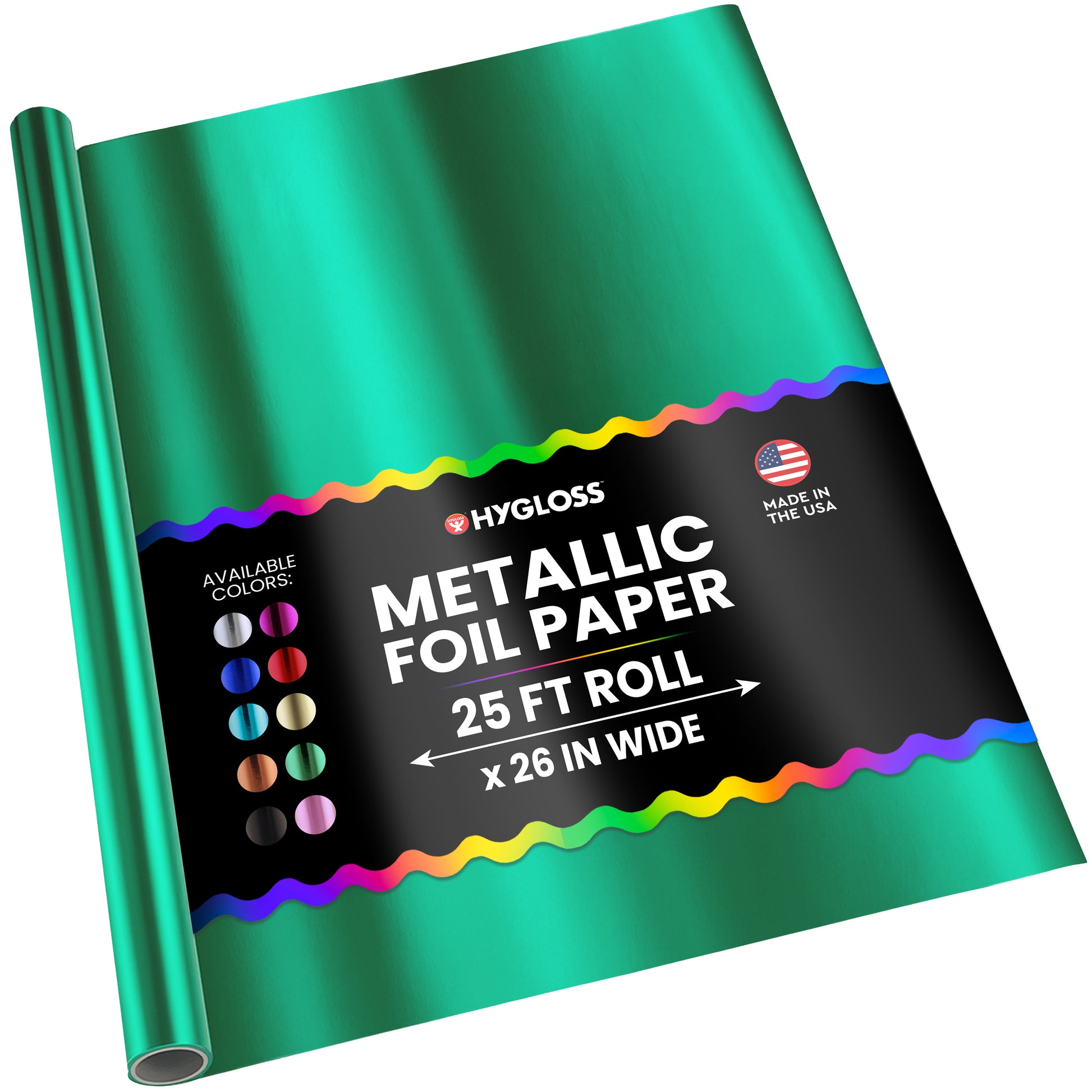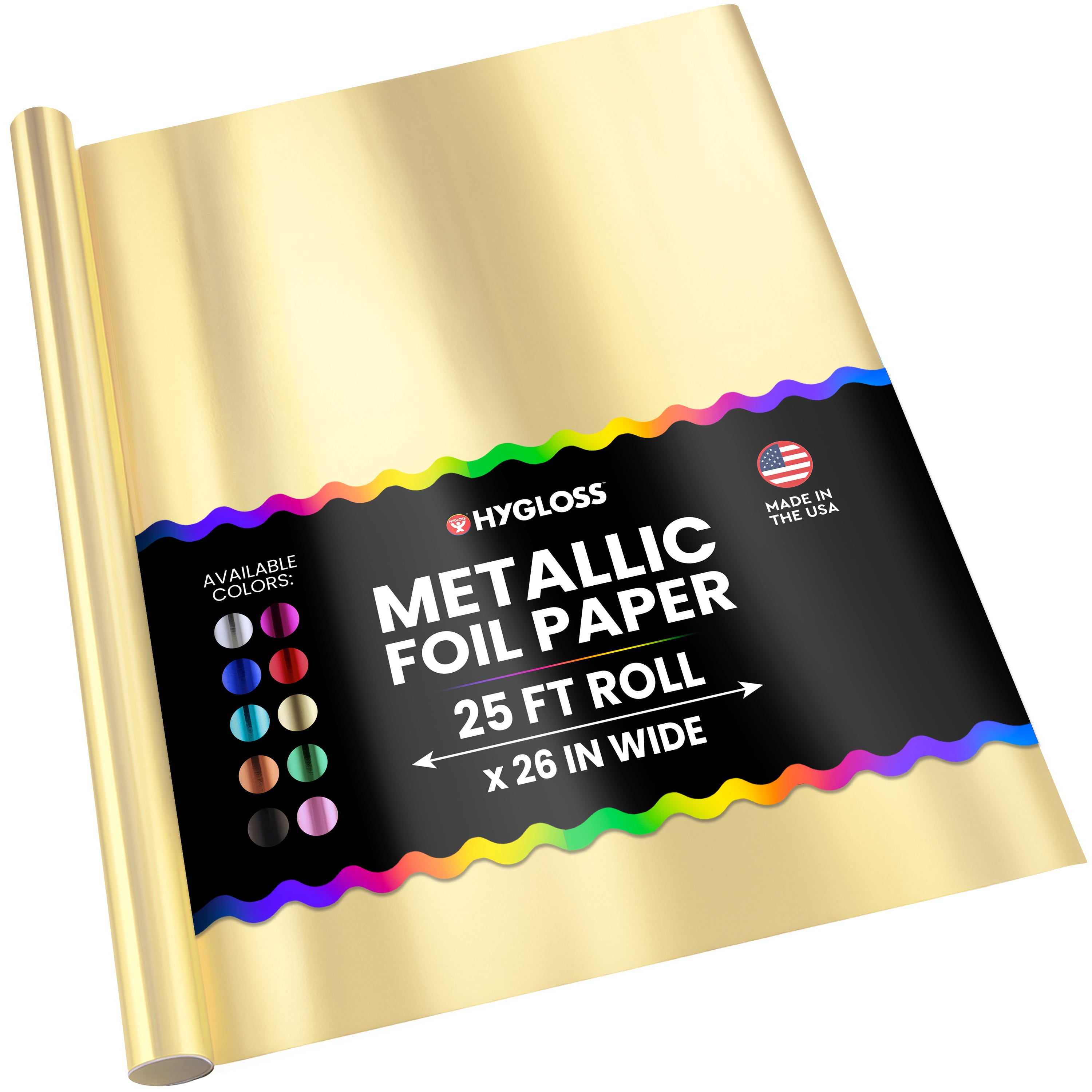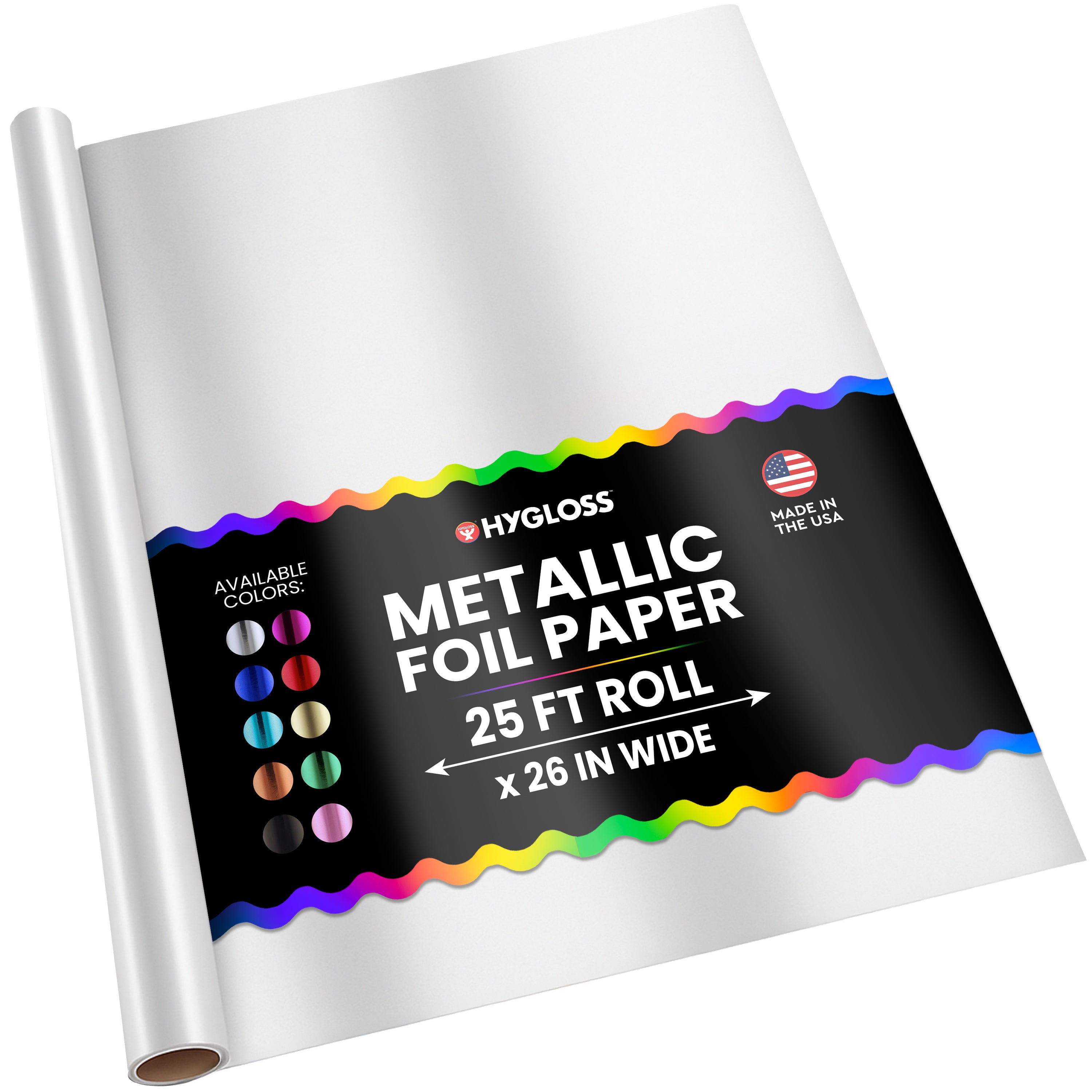The paper on each rolls measures 26 inches tall x 25 feet long. Hygloss metallic foil paper rolls are superior quality shiny paper for all your crafts and gift wrapping. The paper has metallic foil coating on one side and is white on the reverse side. Make a huge variety of bulletin board and wall display items, teaching assistance tools, holiday crafts and decorative projects. Use Metallic Paper Rolls for all your gift-wrap needs; the shiny reflective finish will be the perfect finishing touch to your gifts.