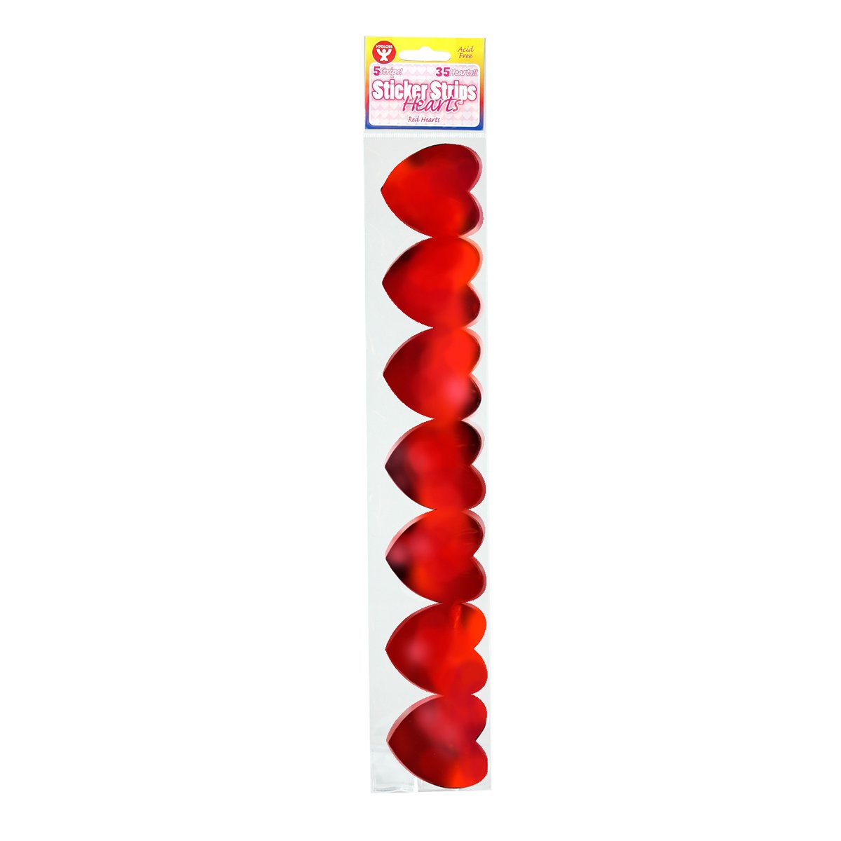 These metallic heart stickers come in strips of 7 metallic heart stickers. Each big sticker shape is approximately 2" in size. With 5 strips per package, you get a total of 35 heart-shaped red stickers. (Each strip measures 2" x 14") Red Hearts Sticker Strips are strips of large self adhesive heart stickers for kids. Use the connected red hearts as poster accents, classroom decorations and bulletin board borders for Valentine's Day. These acid-free, metallic heart stickers are perfect for Valentine crafts and all kinds of kids crafts. Children love to receive big stickers as classroom motivators as well.
