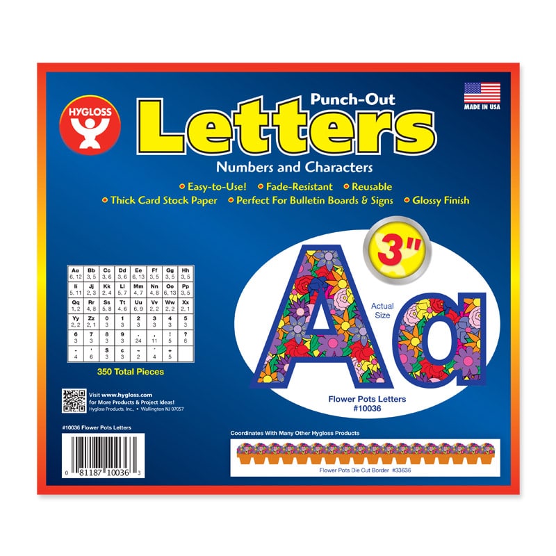 Hygloss Flower Pots Punch-Out Letters make it simple to decorate your bulletin board or classroom! These 350 letters and characters measure 3 inches tall. They are printed on premium quality card stock with a glossy finish. These Punch-Out Bulletin Board Letters in Flower Pots design bloom to life with colorful flowers! Introduce Spring, Flowers, Mother's Day, and more themes with flower pot style. The 350 letters, numbers and characters are printed on premium quality card stock with a glossy finish. They are durable and easy to use. For a super-coordinated classroom, check out our other FLOWER POTS THEMED PRODUCTS.