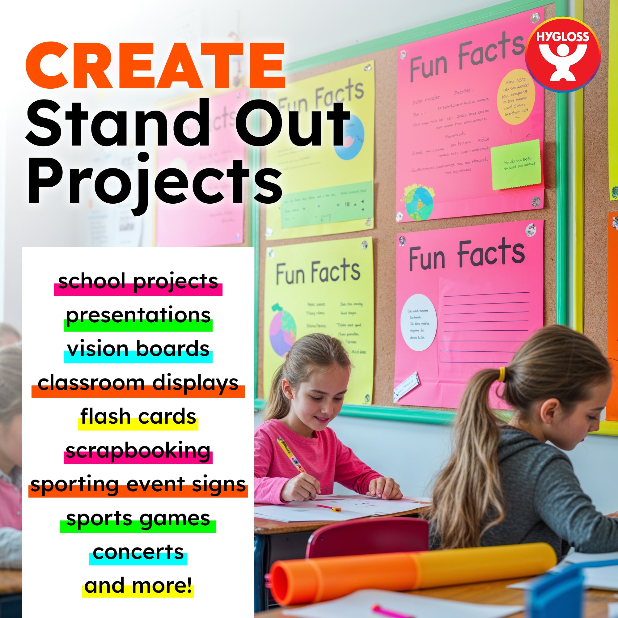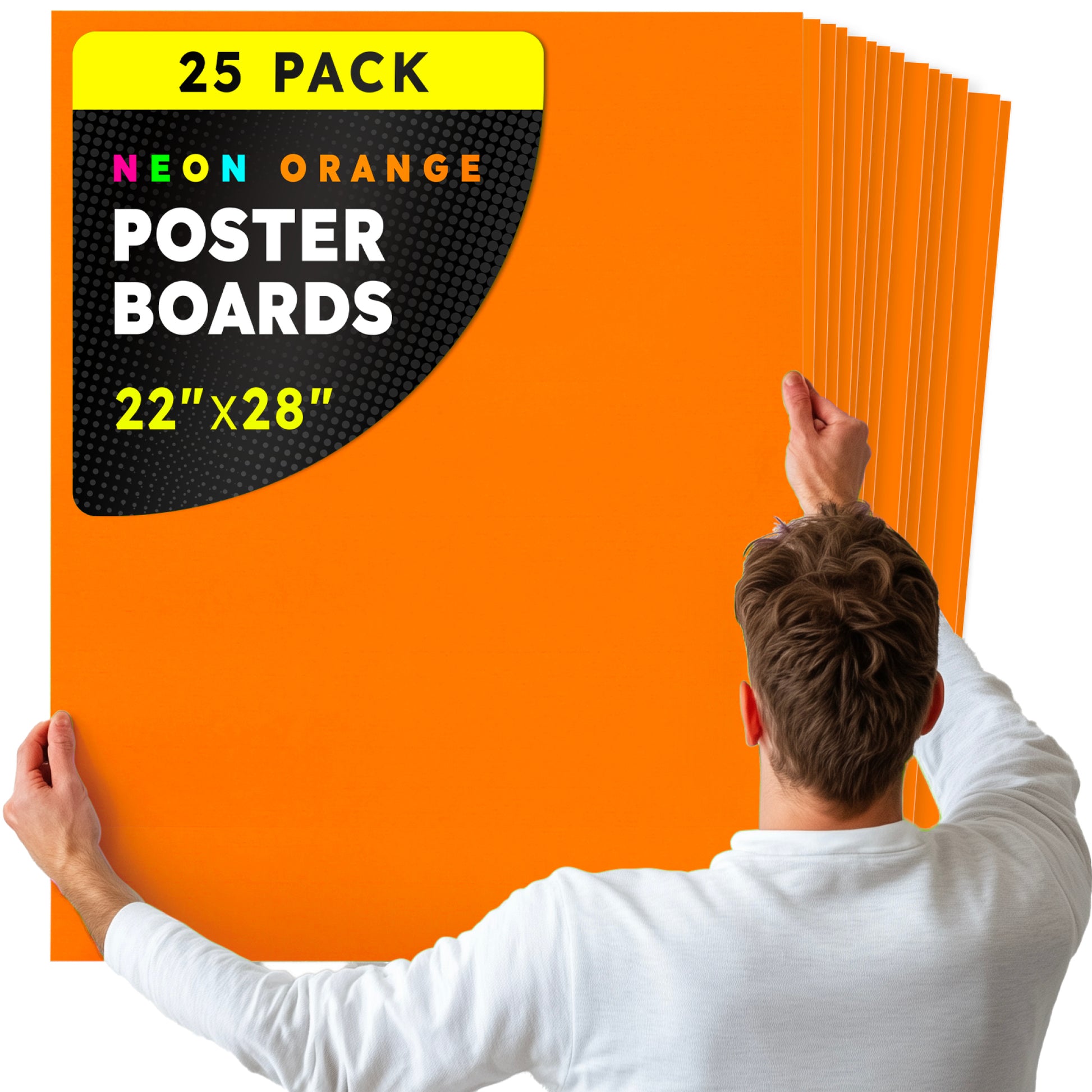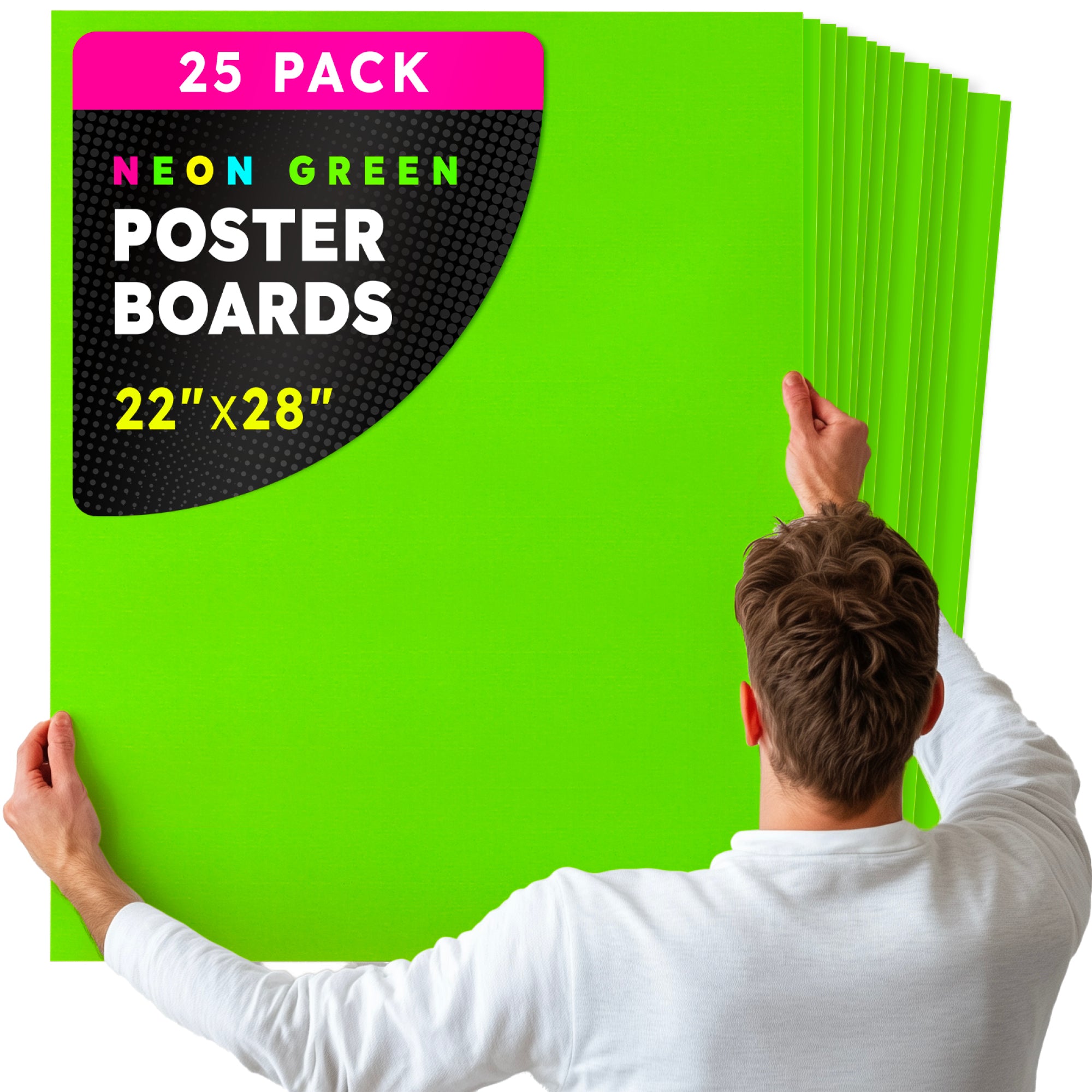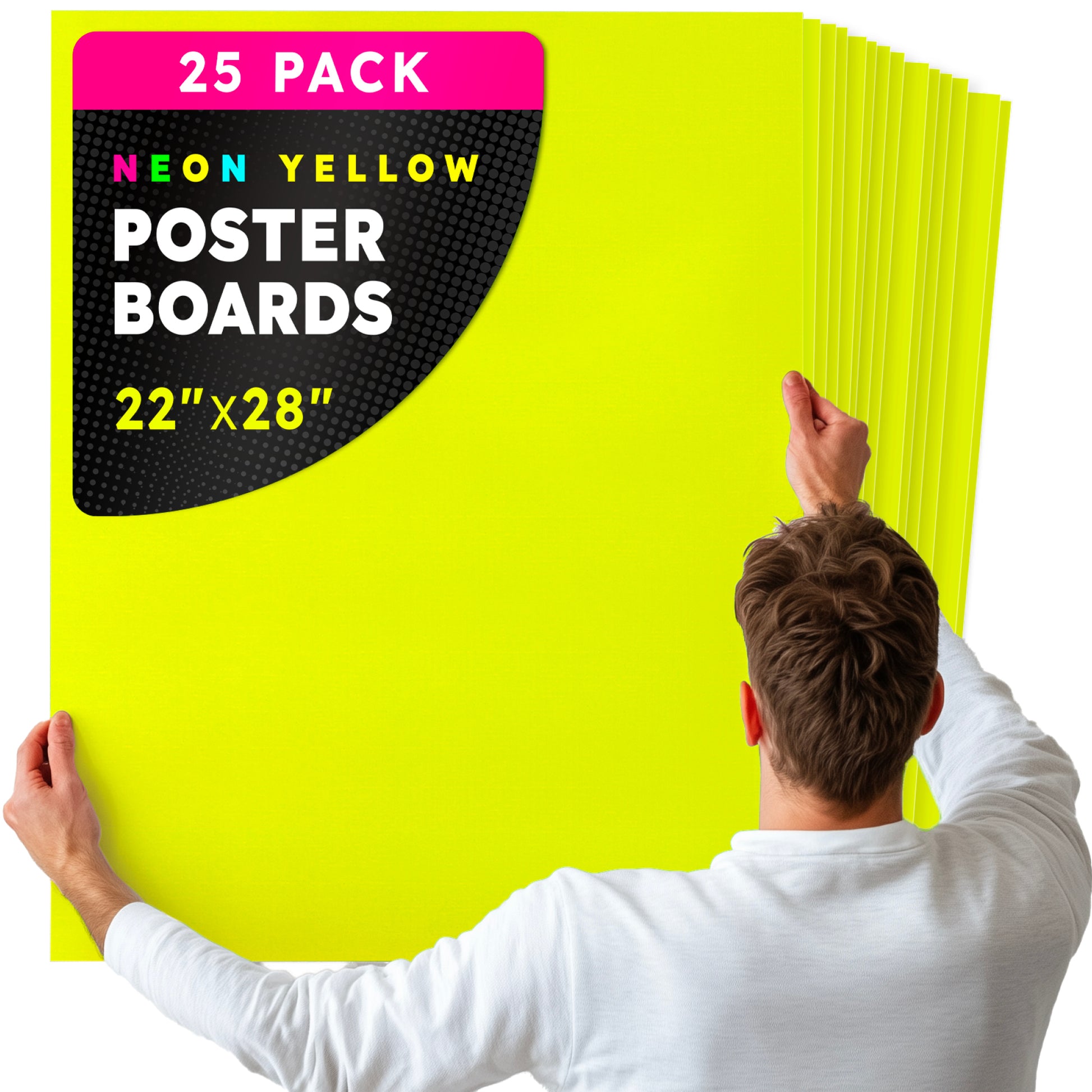 Choose from 2 sizes: 22 x 28 inches or 11 x 14 inches. The all-popular neon poster board is now available in an upgraded version: colored on both sides! Use Hygloss Double Sided Fluorecsent Poster Board for all your craft needs. From classroom decorations to eye-catching posters, these exciting fluorescent colors will give your projects and signs some extra glow! These premium quality poster boards are great for 3-D crafts, costumes, party decor and more. Package includes 25 fluorescent poster board sheets. Choose between a pack of 11 x 14 inch poster boards, or a dispenser box of large size posterboards measuring 22 x 28 inches.