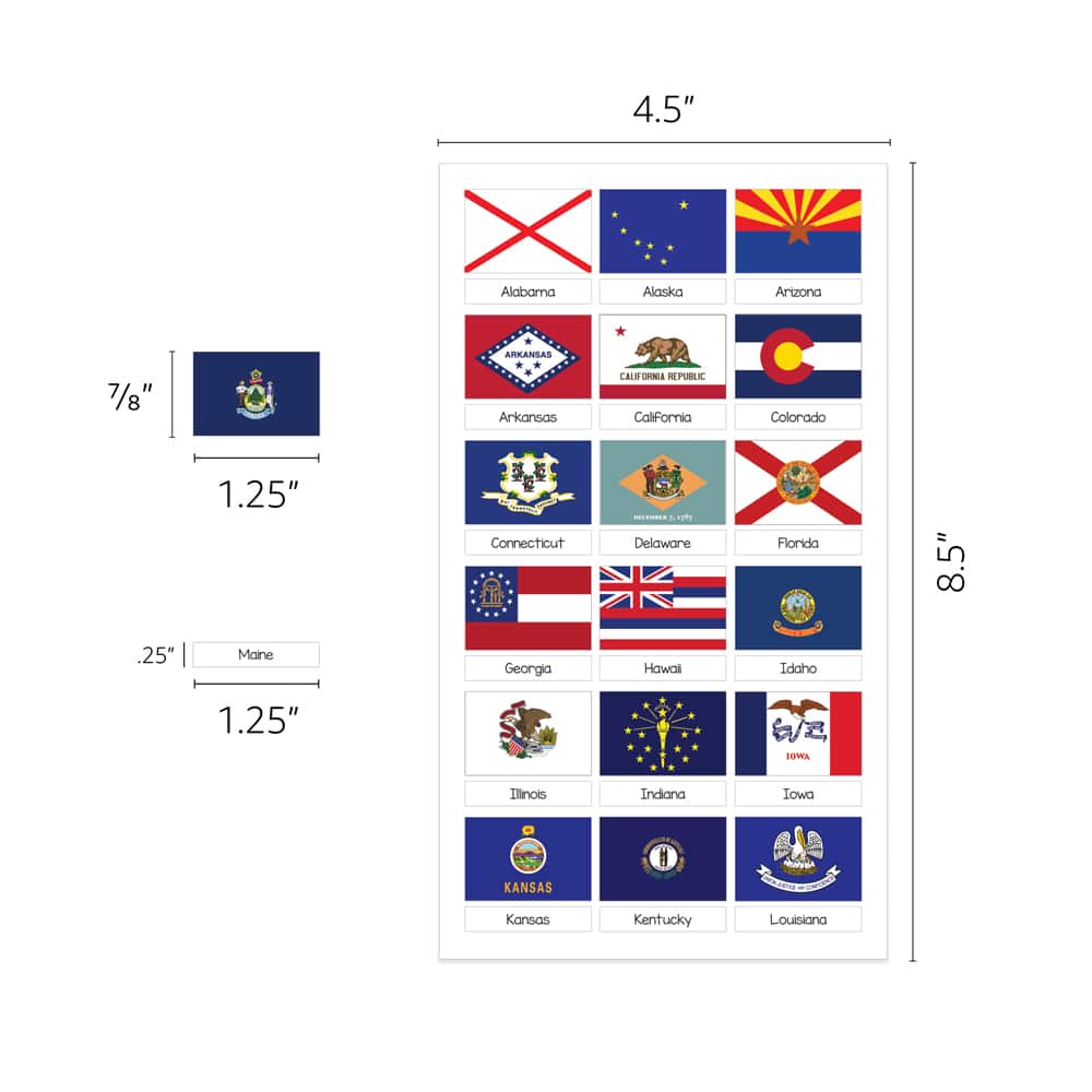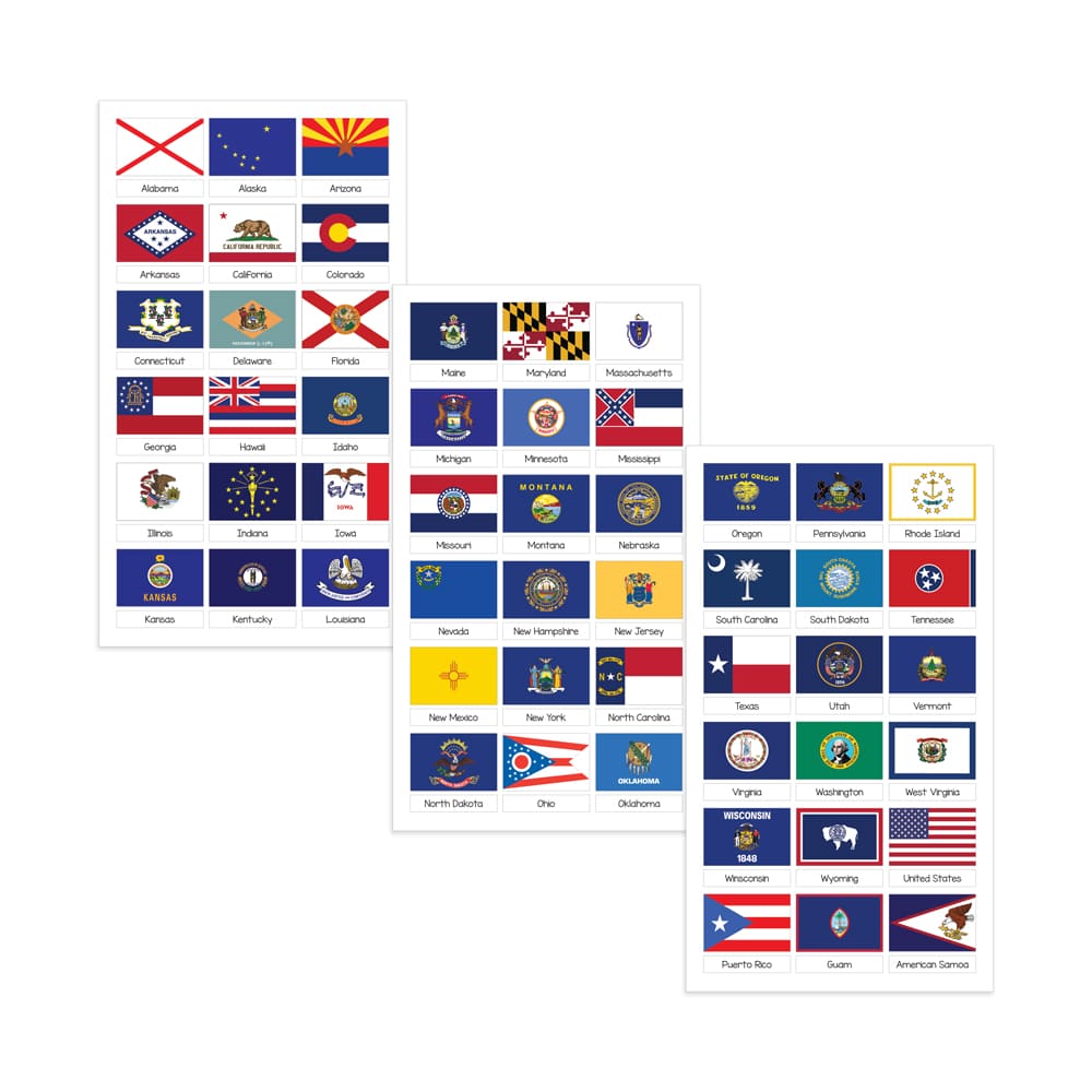 Teach and learn with these 54 state flags and seals! Stickers includes all 50 states, Puerto Rico, Guam, American Samoa, and the American Seal. Great for crafts, maps, or blank passport books.