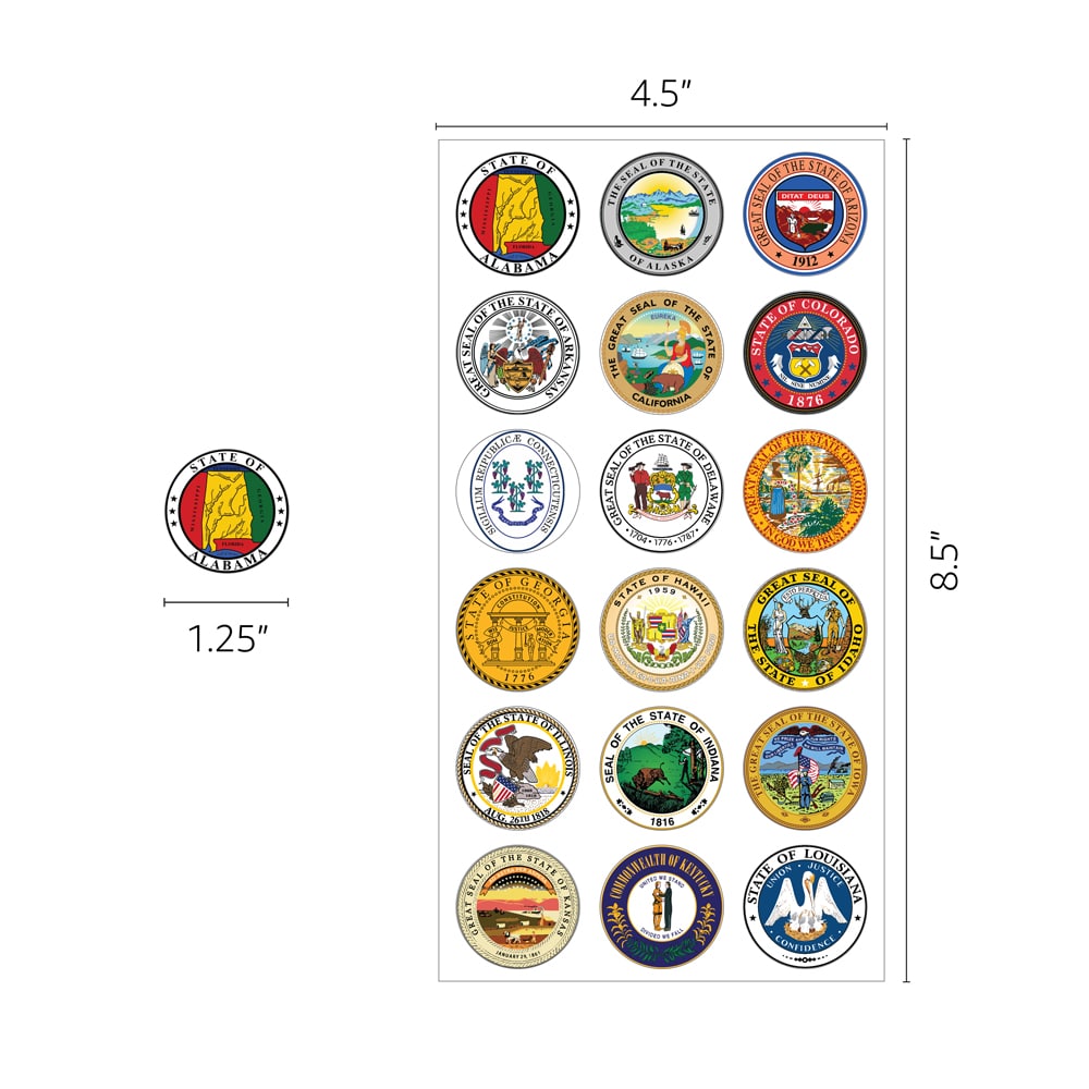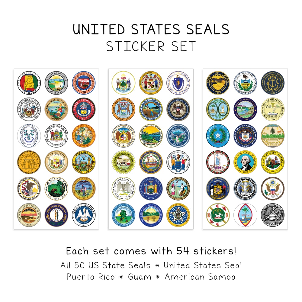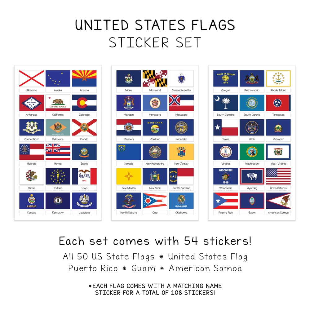 Introducing our new line of United States Flag and Seal Stickers for all 50 States! Perfect for kids and teachers, each set includes all 54 state flags in one convenient package. Each sticker sheet contains 18 stickers, for a total of 54 stickers. You get one flag or seal for each of the 50 states, as well as Puerto Rico, Guam, American Samoa, and the American flag.